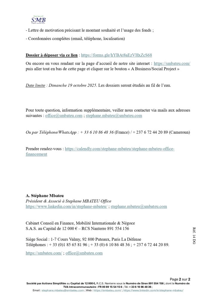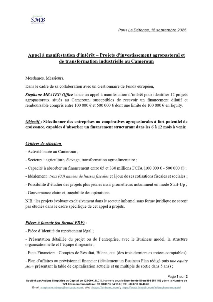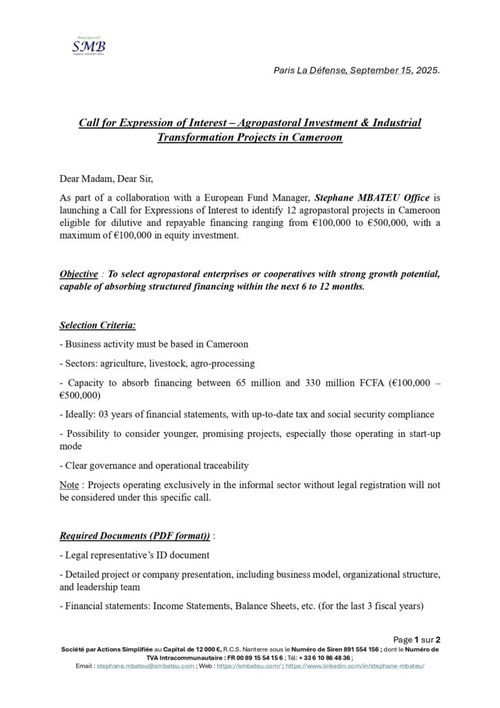 As part of the collaboration with a European fund manager, Stephane MBATEU Office is launching a call for expressions of interest to identify 12 agropastoral projects in Cameroon. Each selected project may receive structured financing between €100,000 and €500,000, including a portion in equity.